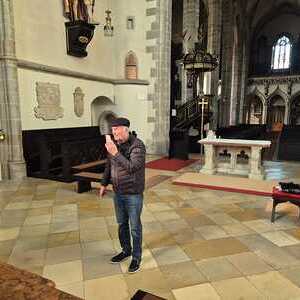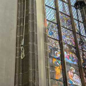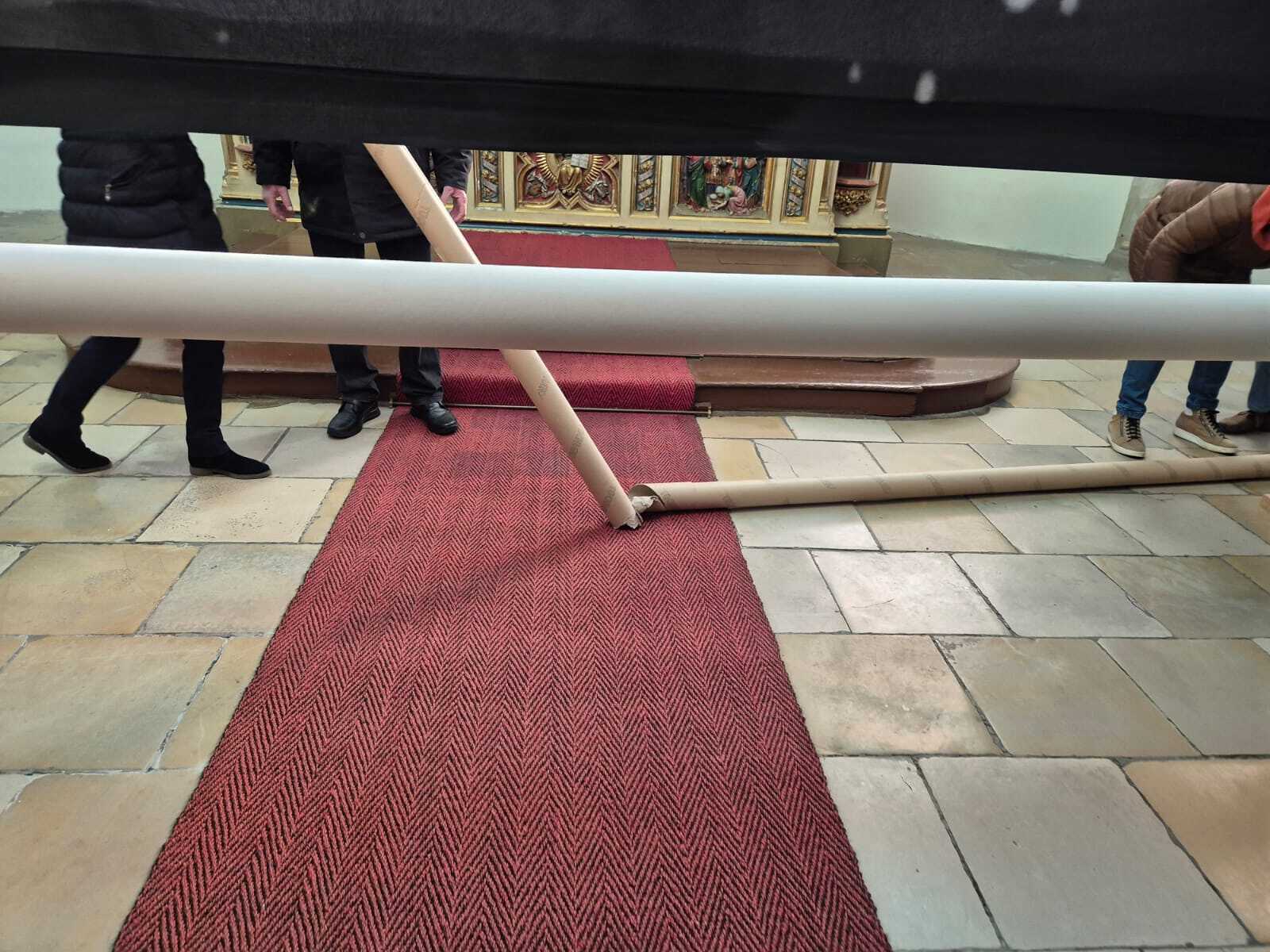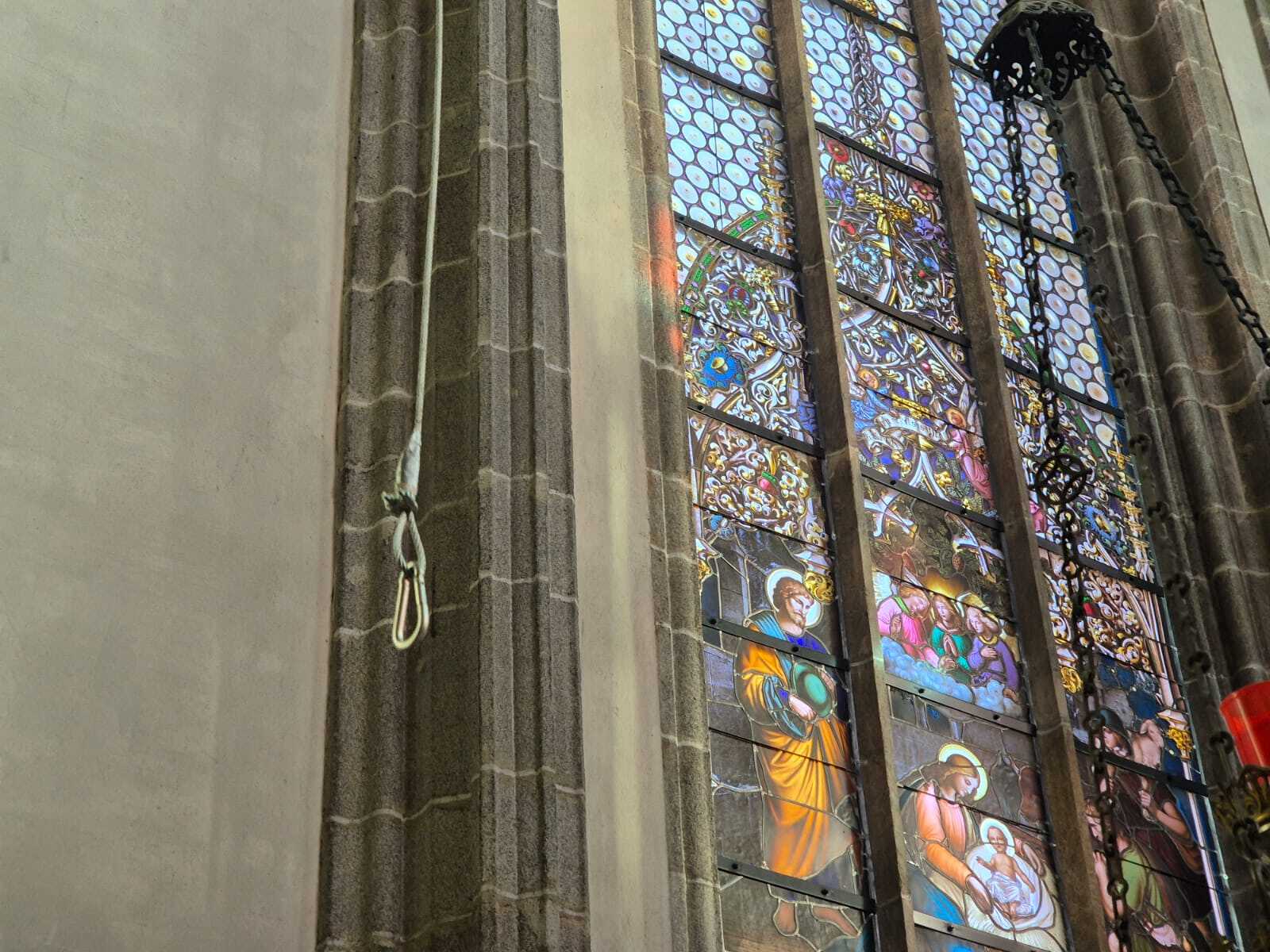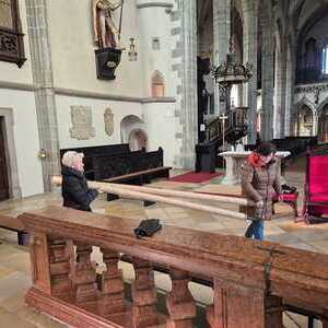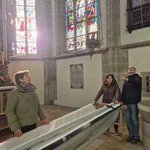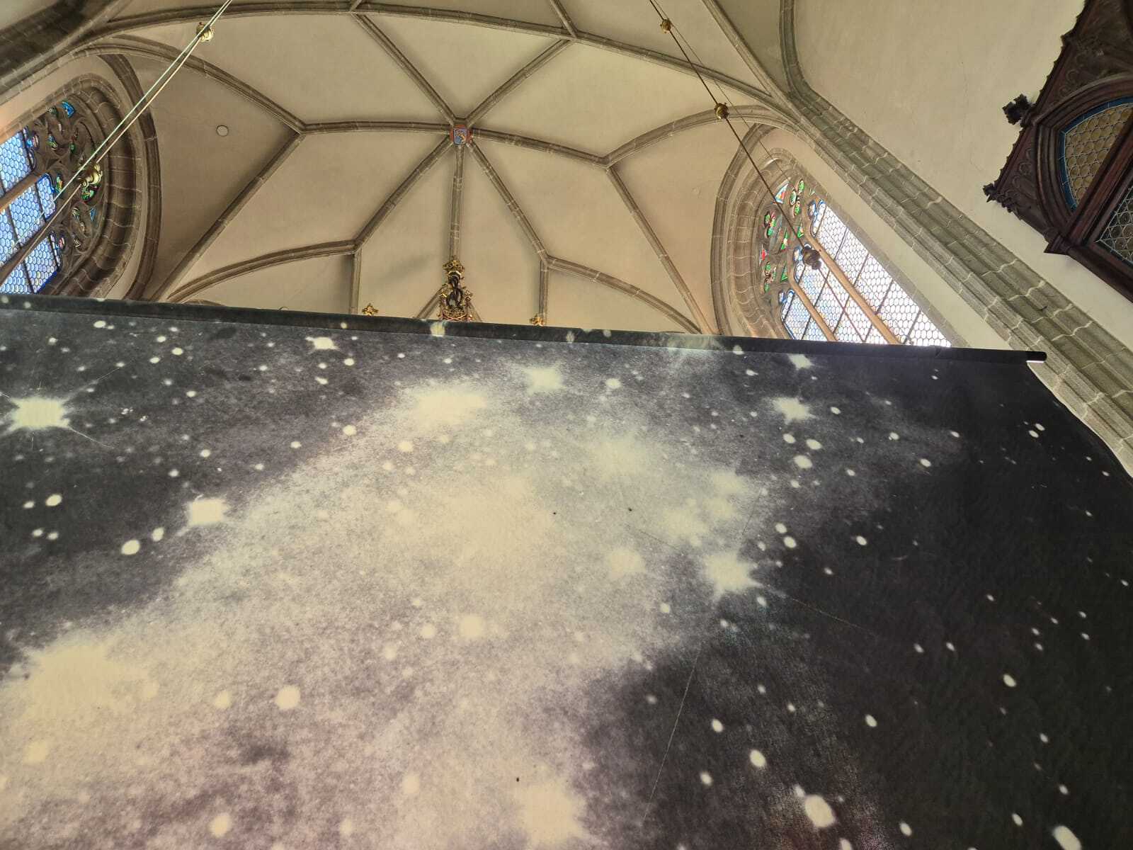 Seit 2013 treffen sich Mitarbeiter*innen der Pfarrgemeinde am Aschermittwoch zum Aufhängen des Fastentuches. Dass die Übung gelingt, braucht es fachkundige Hände und Teamarbeit.