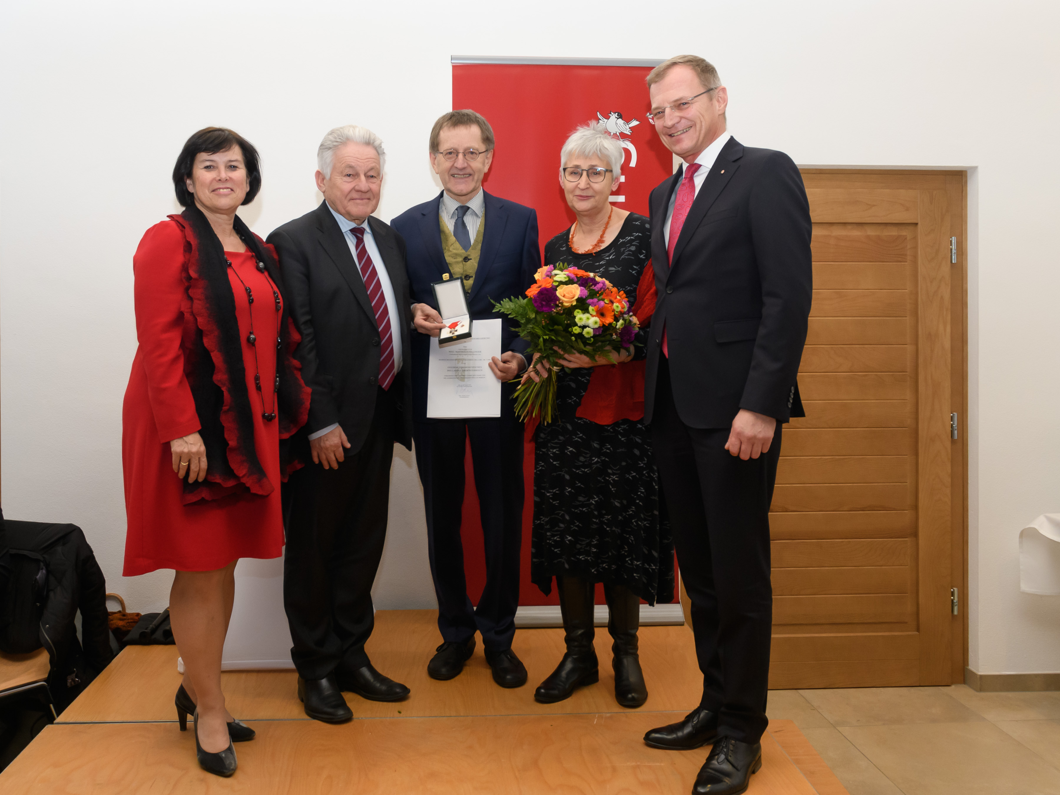 Foto 1: Matthäus Fellinger wurde mit dem Goldenen Verdienstzeichen des Landes Oberösterreich ausgezeichnet. V. l.: Landesrätin Birgit Gerstorfer, Landeshauptmann a. D. Josef Pühringer, der Geehrte Matthäus Fellinger, seine Frau Maria Fellinger-Hauer und Landeshauptmann Thomas Stelzer.