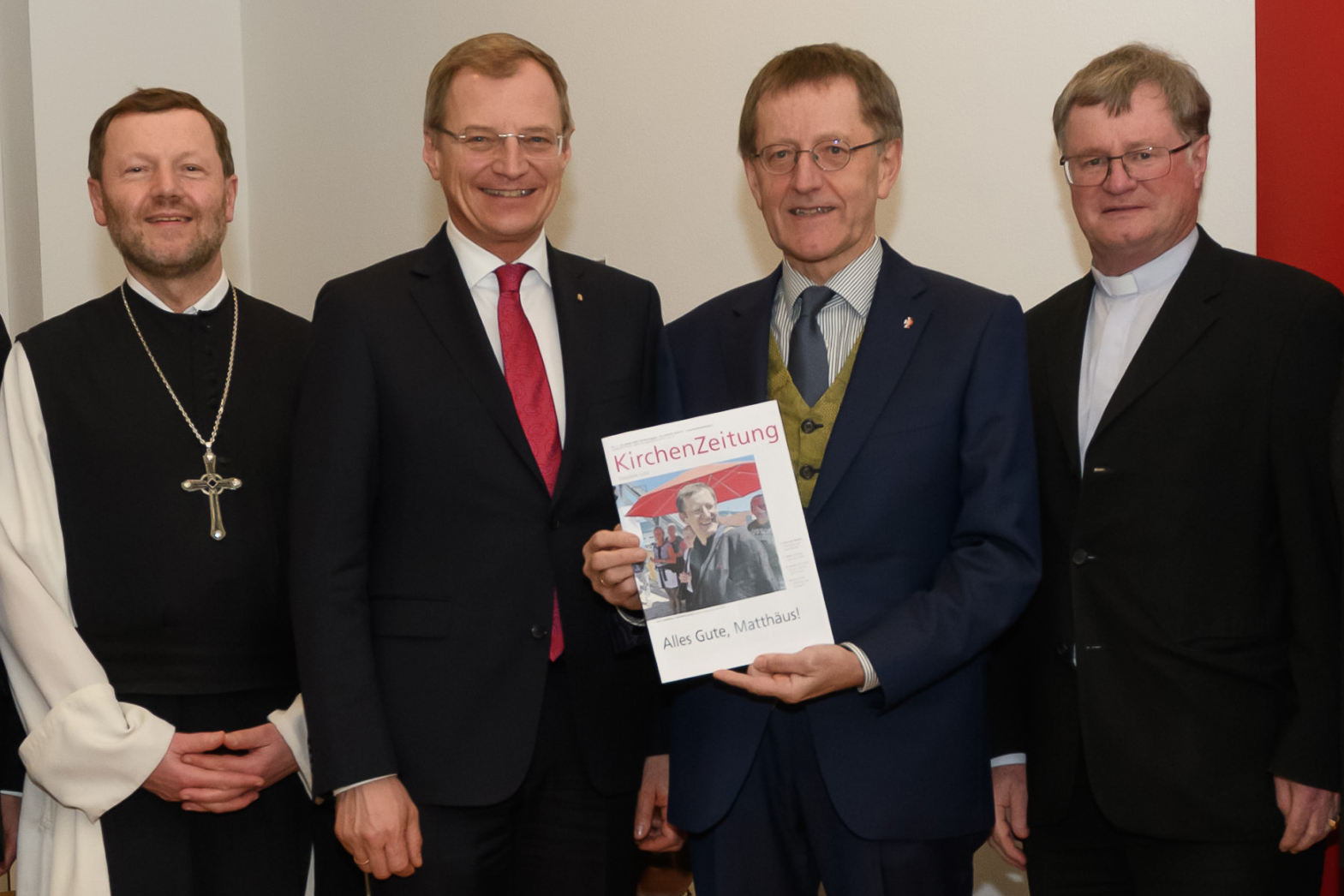 Foto 2: V. l: Hausherr Abt Reinhold Dessl vom Stift Wilhering, Landeshauptmann Thomas Stelzer, Matthäus Fellinger mit der Sonderausgabe der KirchenZeitung und Bischof Manfred Scheuer.
