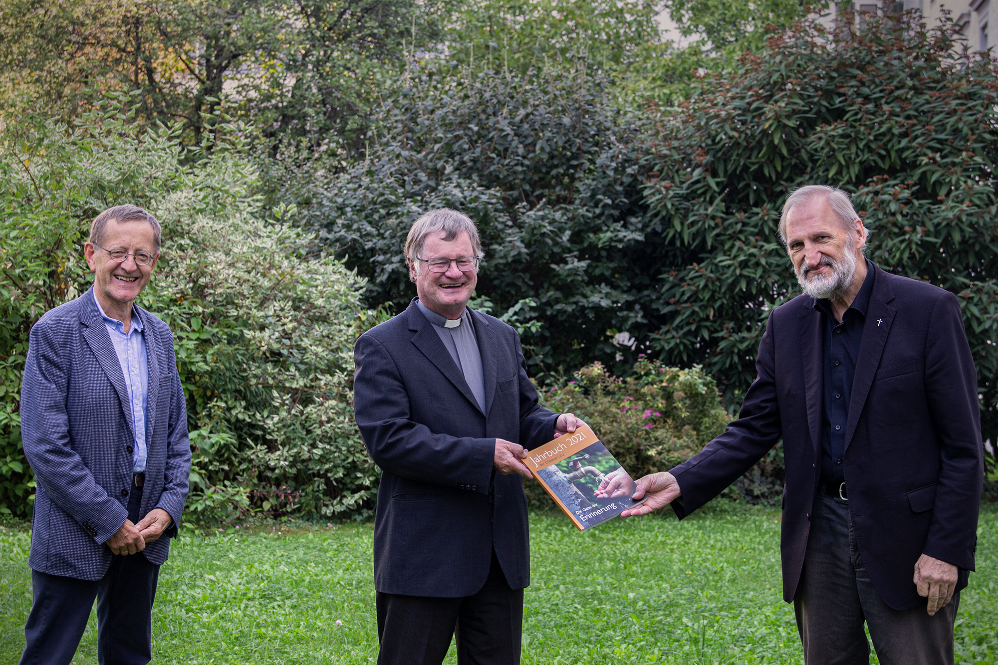 Jahrbuch-Herausgeber Wilhelm Vieböck (re) überreicht das neue Jahrbuch an Bischof Manfred Scheuer. Links Jahrbuch-Redakteur Matthäus Fellinger © Diözese Linz_Appenzeller