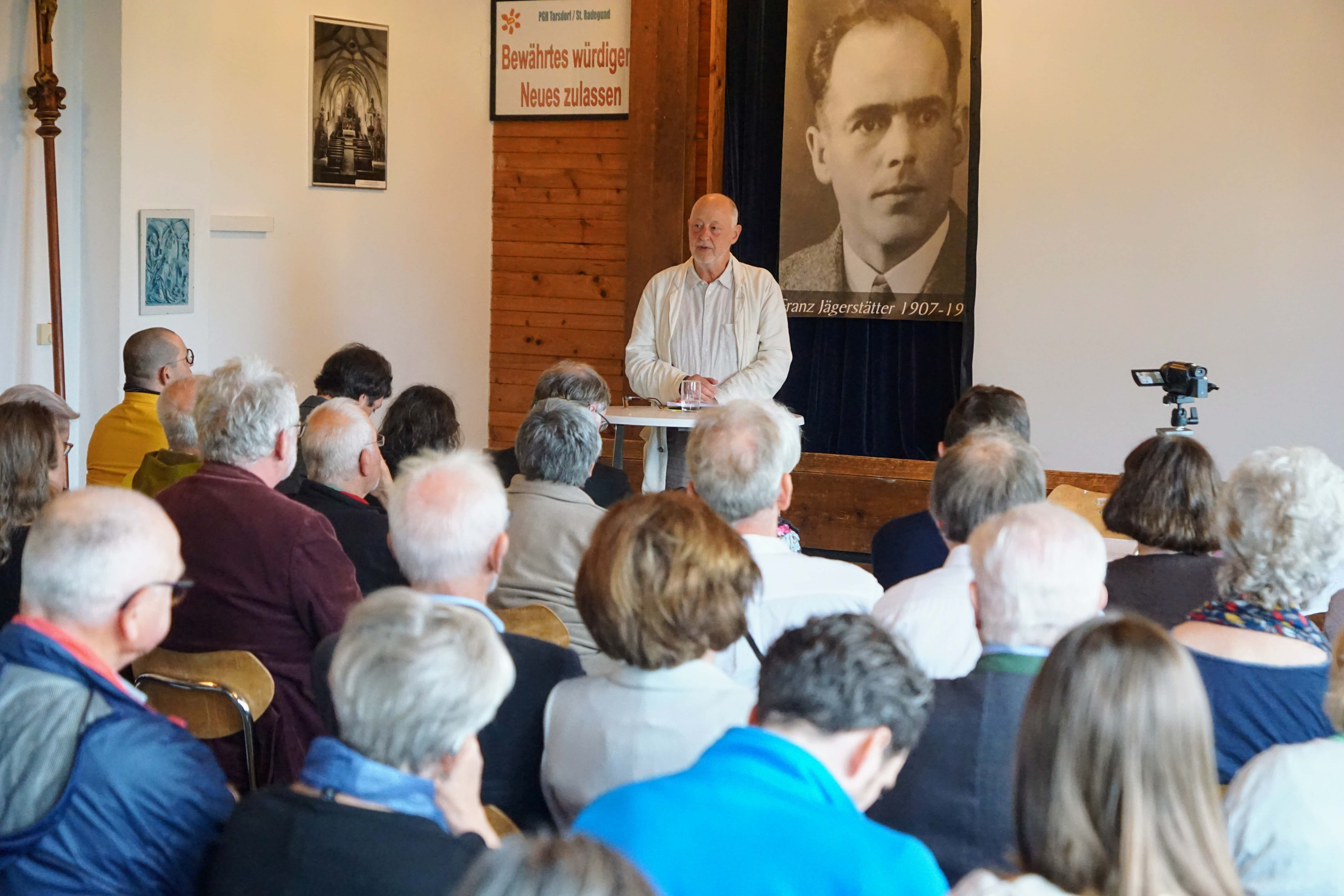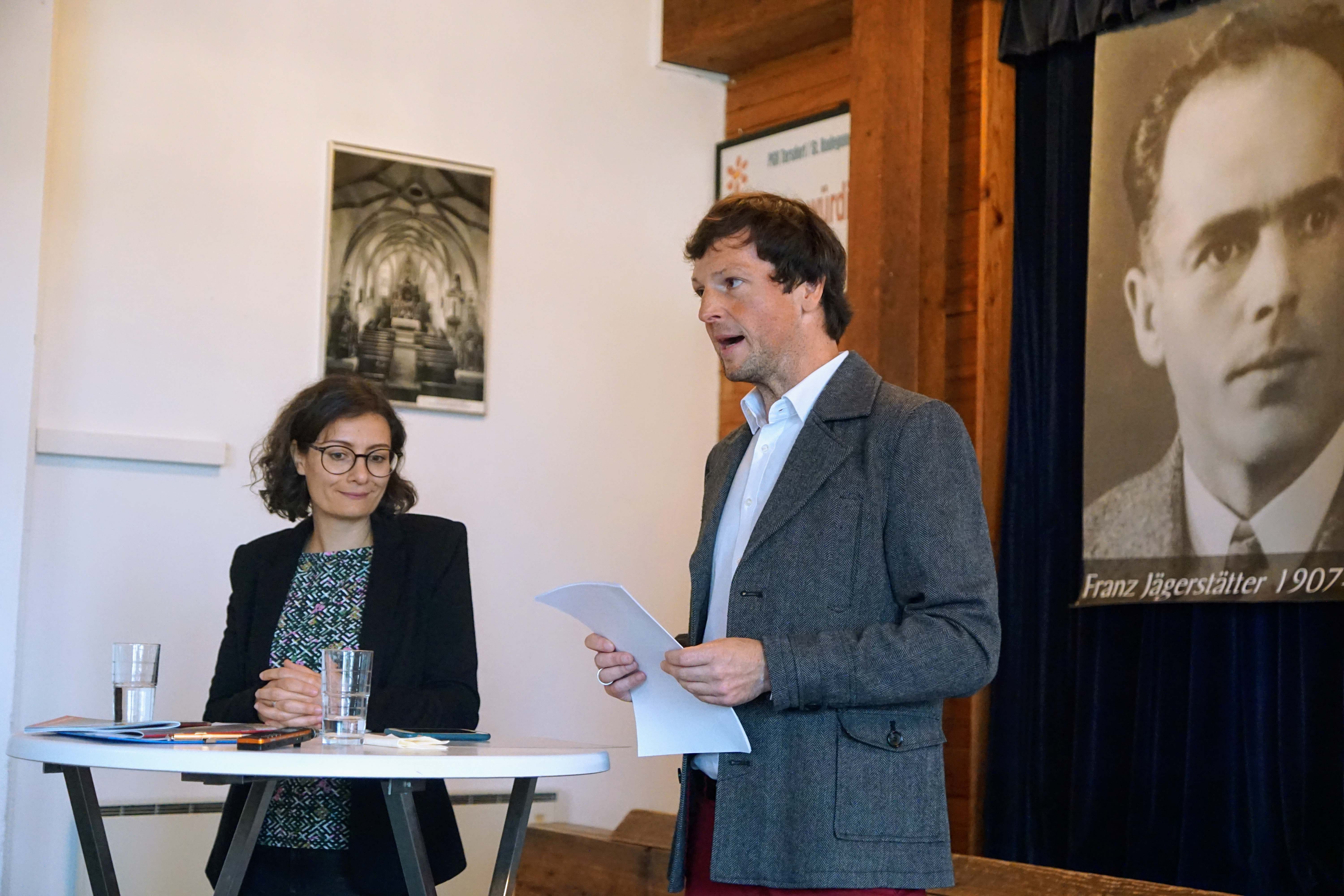 Am Vormittag stellten im Pfarrheim Tarsdorf Andreas Schmoller und Verena Lorber vom Franz und Franziska Jägerstätter Institut Linz die neue digitale Jägerstätter-Edition vor. Diese wurde von der Katholischen Privat-Universität (KU) Linz und dem dort angesiedelten Franz und Franziska Jägerstätter Institut (FFJI) herausgegeben und beinhaltet den bisher umfassendsten Bestand an Schriften und Korrespondenzen des seliggesprochenen Kriegsdienstverweigerers und Märtyrers. Die Schriften sind über die eigens eingerichtete Webseite https://edition.jaegerstaetter.at frei zugänglich.