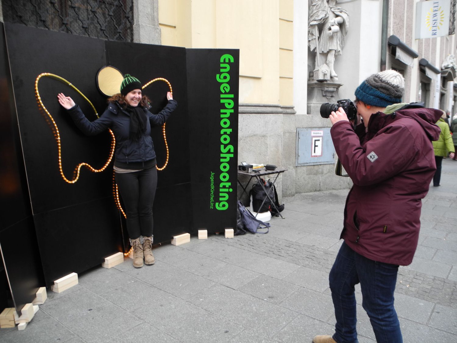 Die Aktion „EngelFotoShooting“ findet heuer zum zweiten Mal im öffentlichen Raum statt. An zwei Samstagen im Advent – am 12. und 19. Dezember 2015 – steht Klemens Hager, Projektleiter der JugendKirche Linz, mit seinem Team vor der Linzer Ursulinenkirche. Seine Ausrüstung: eine Kamera, ein Drucker und eine schwarze Wand, an der Engelflügel und ein Heiligenschein montiert sind. Er lädt PassantInnen ein, für einen Engel-Schnappschuss innezuhalten. Viele nehmen das Angebot an und freuen sich über ein fröhliches Engel-Foto, das sie sofort mitnehmen können – ob als persönliche Erinnerung, als Geschenk oder als besonderen Weihnachtsgruß.